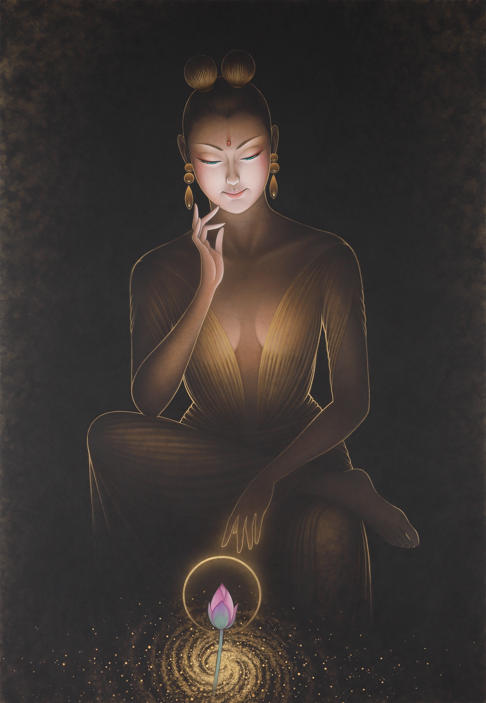 Home › › 弥勒菩薩 五十六億七千万年の闇の向う 2026-02-04 弥勒菩薩 五十六億七千万年の闇の向う 弥勒菩薩 五十六億七千万年の闇の向う 作者名 鶴田一郎 制作年 2025年12月版画制作 額縁サイズ H725mm×W530mm 慈愛の微笑みをたたえ、しなやかな指先でそっと頬に触れる弥勒菩薩 関連記事 Close-Up 中島千波 お気に入りの一枚 鶴田一郎 「2019年最新作発表 鶴田一郎来場展」2019. 11月7日(木)〜11月10日(木)ギャラリーユマニテ Close-Up フジ子・ヘミング Close-Up マイケル・ルー